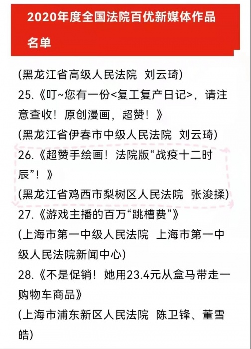 近日,2020年度全国法院“十佳百优”新媒体账号和作品推选结果揭晓,其中,梨树区人民法院政治部干警张浚揉创作的原创漫画《超赞手绘画!法院版“战疫十二时辰”!》微信公众号荣获“2020年度全国法院百优新媒体作品”。